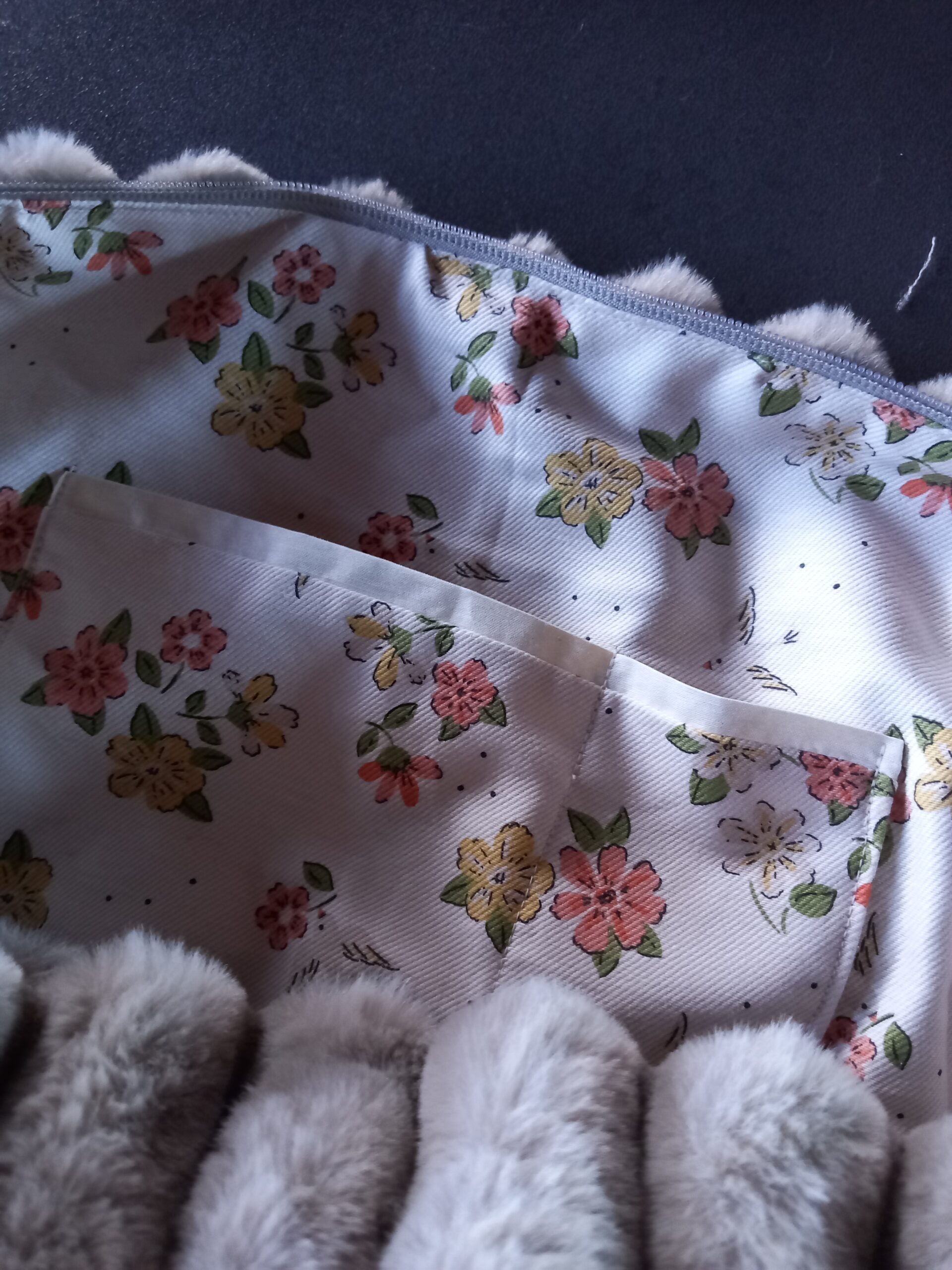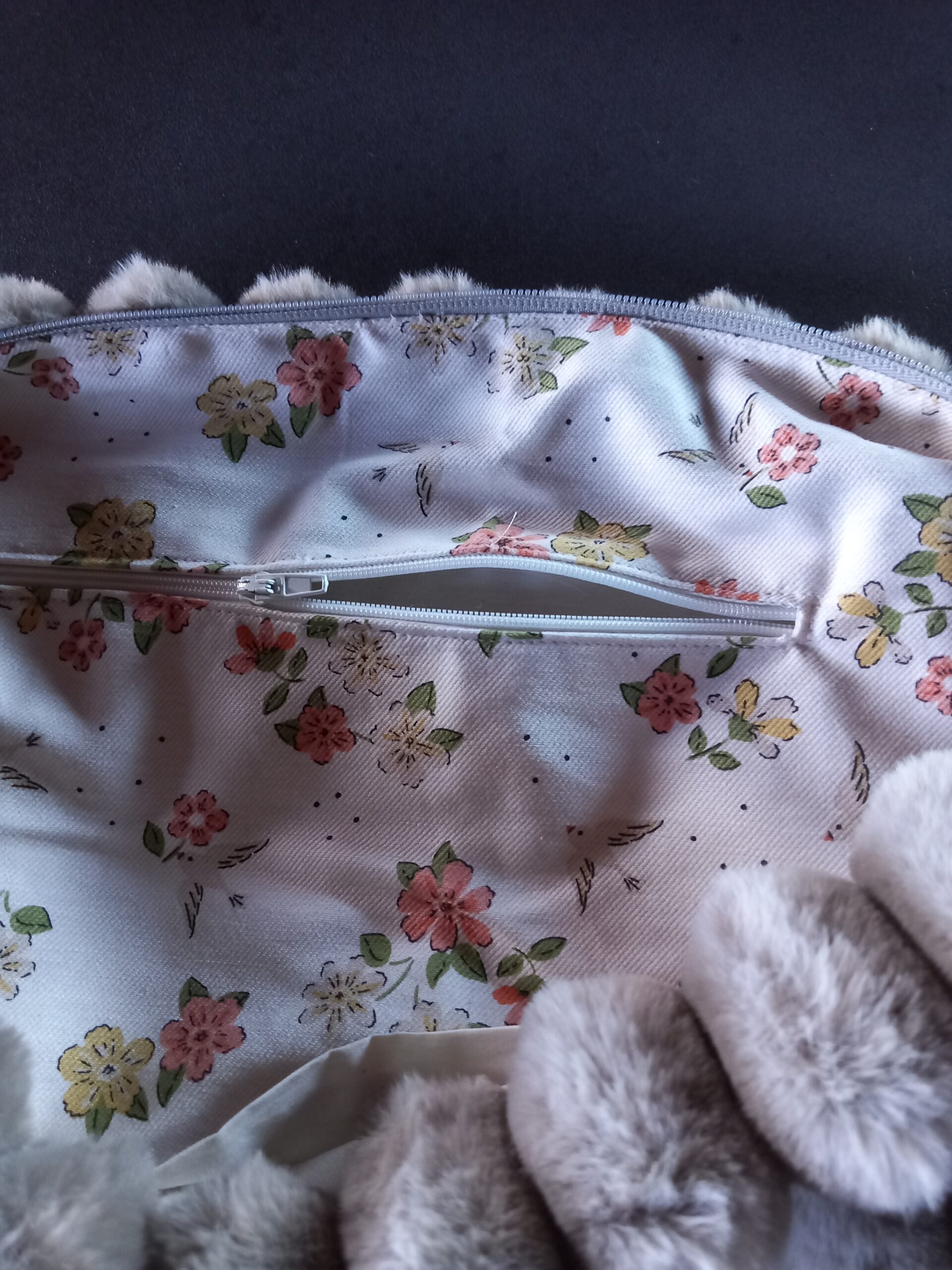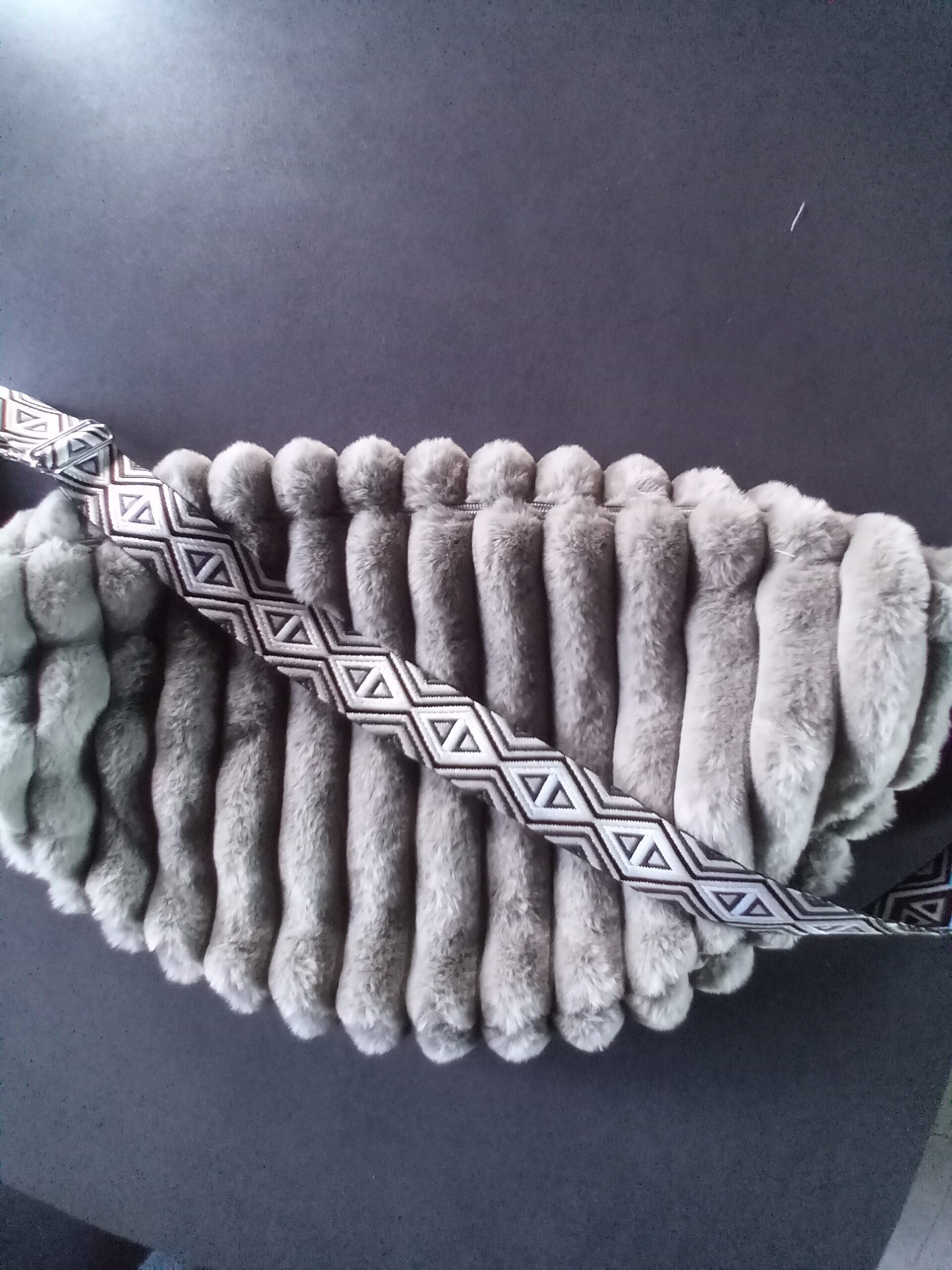 J’ai confectionné ce grand sac forme 1/2 lune en fourrure synthétique structurée en bande couleur marron glacé, son ouverture zippée est de 45cm. A l’intérieur une poche zippée de 20cm et une autre plaquée de 18cm séparée en deux. Une large sangle de 3.80cm aux dessins géométriques de 125cm amovible et réglable. Le tout entièrement doublé.
