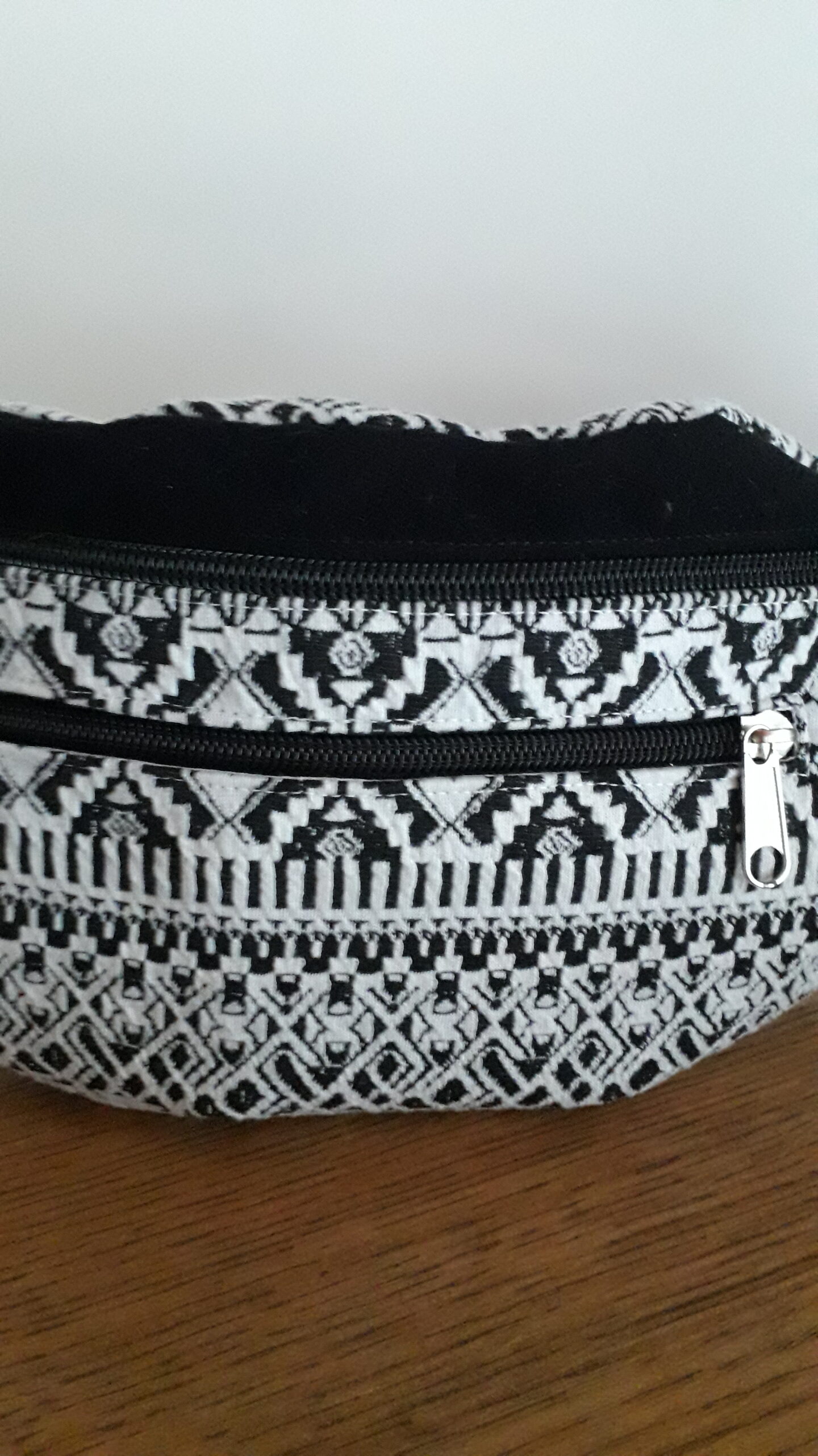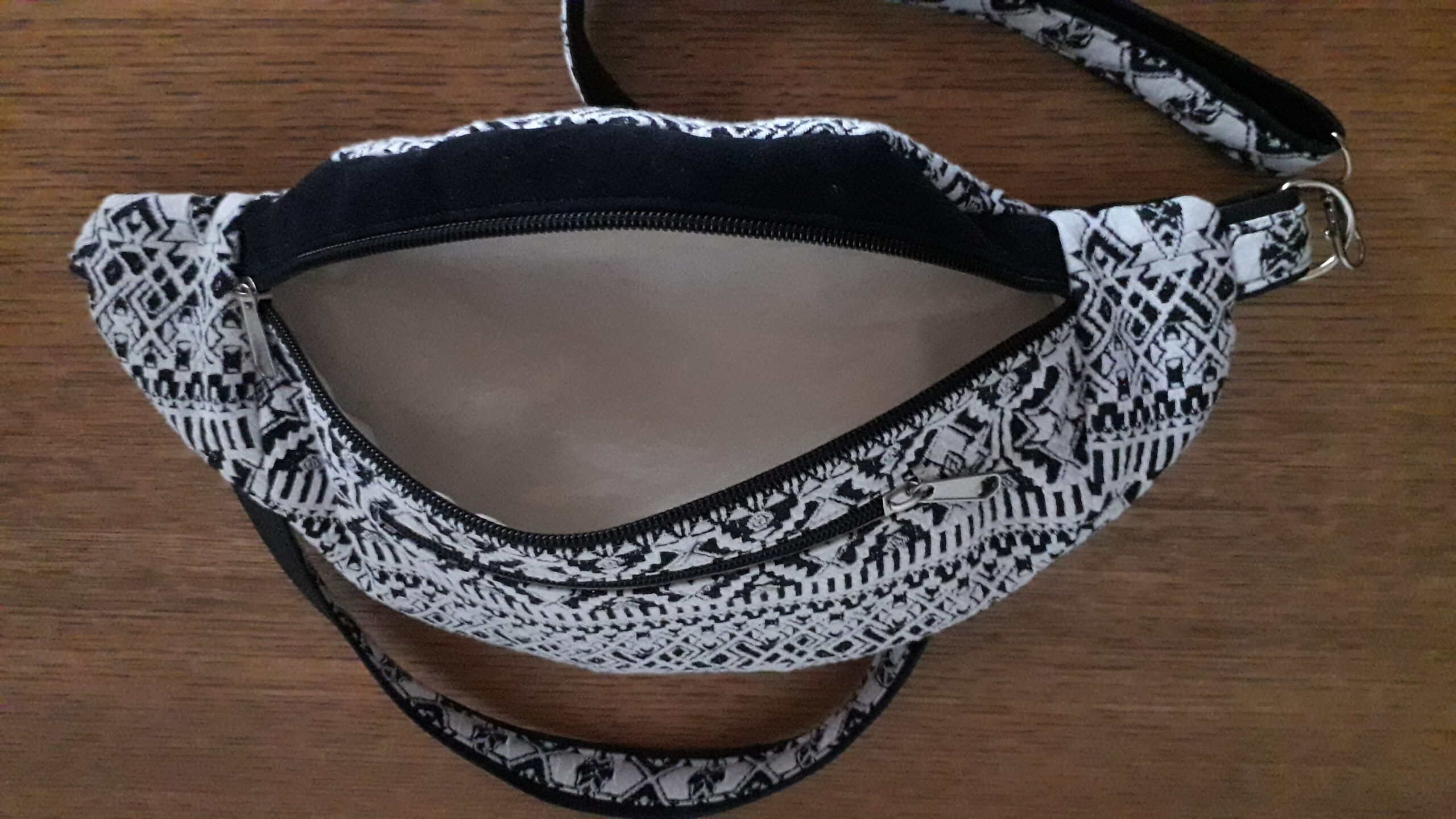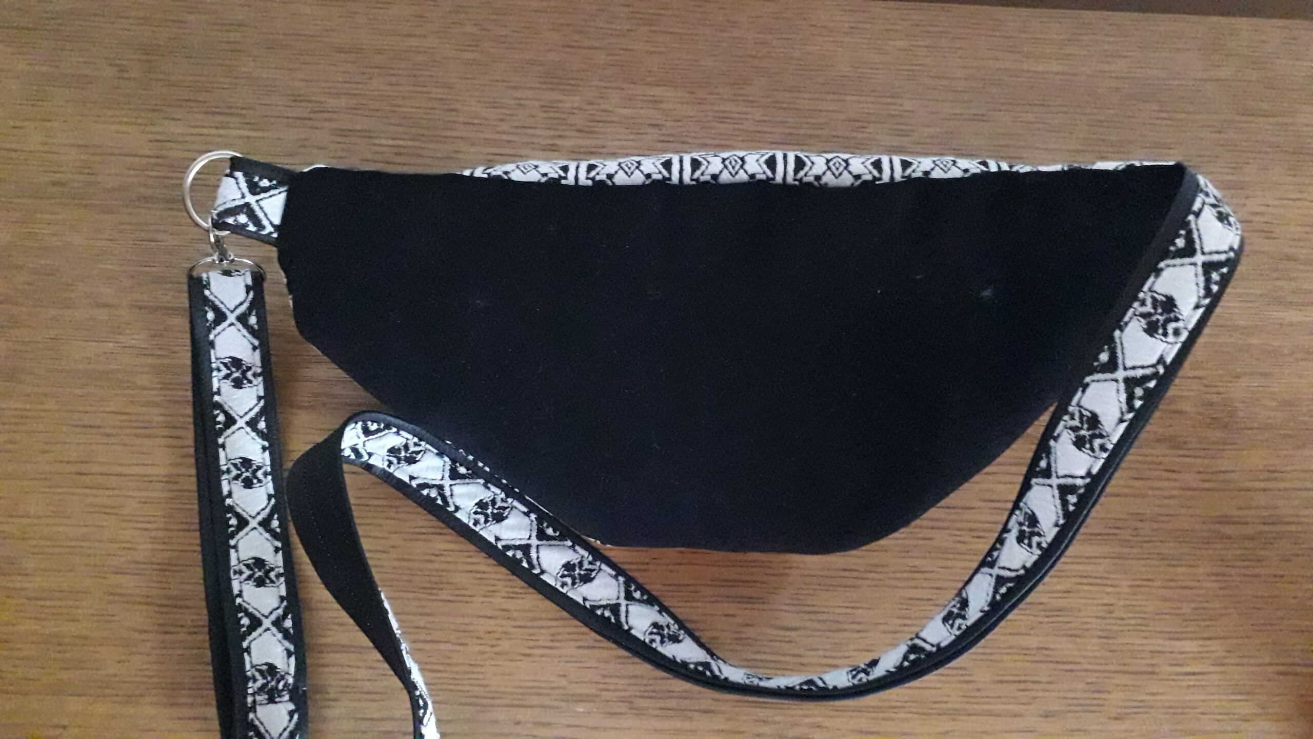 J’ai confectionné cette jolie banane dans un tissus 30% coton/70% polyester avec un motif géométrique noir et blanc, un bande sur le devant et le dos en suédine noire très douce.