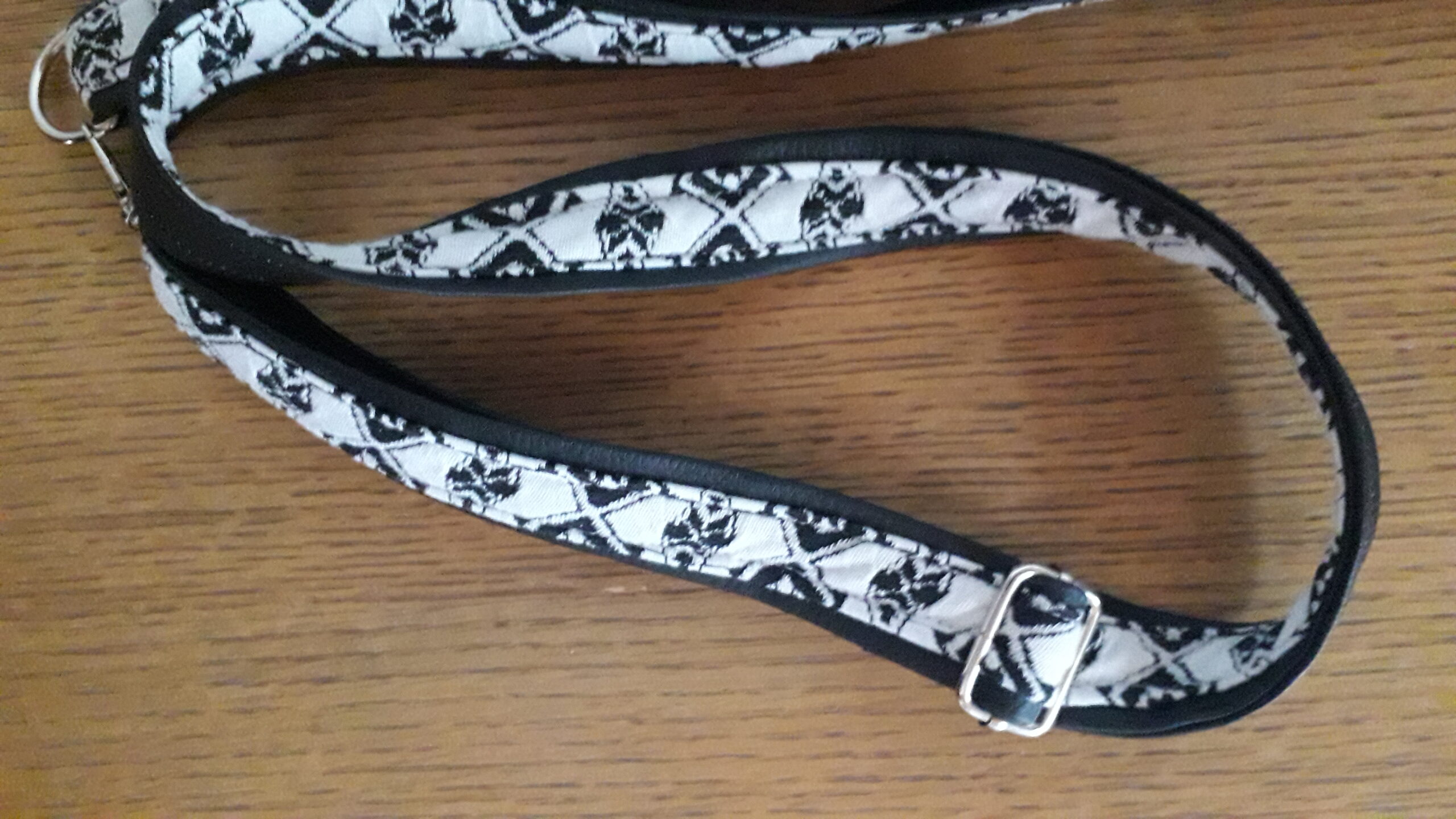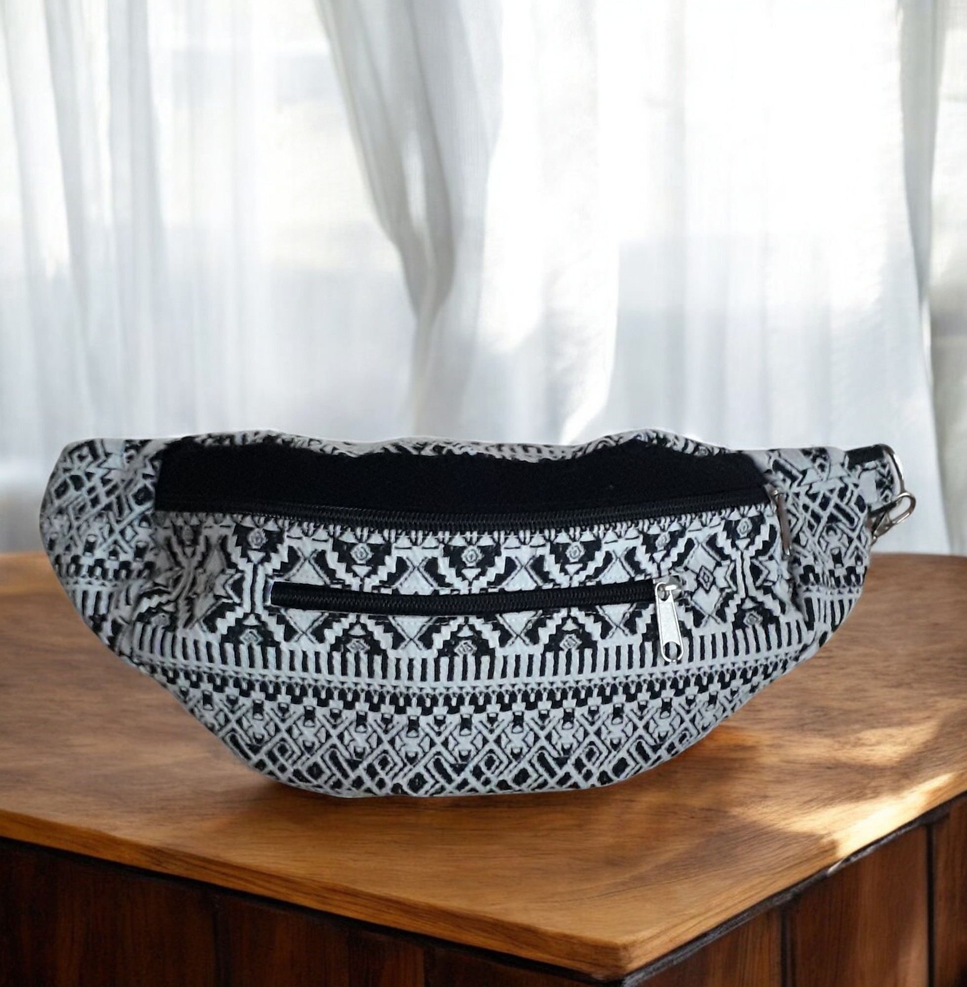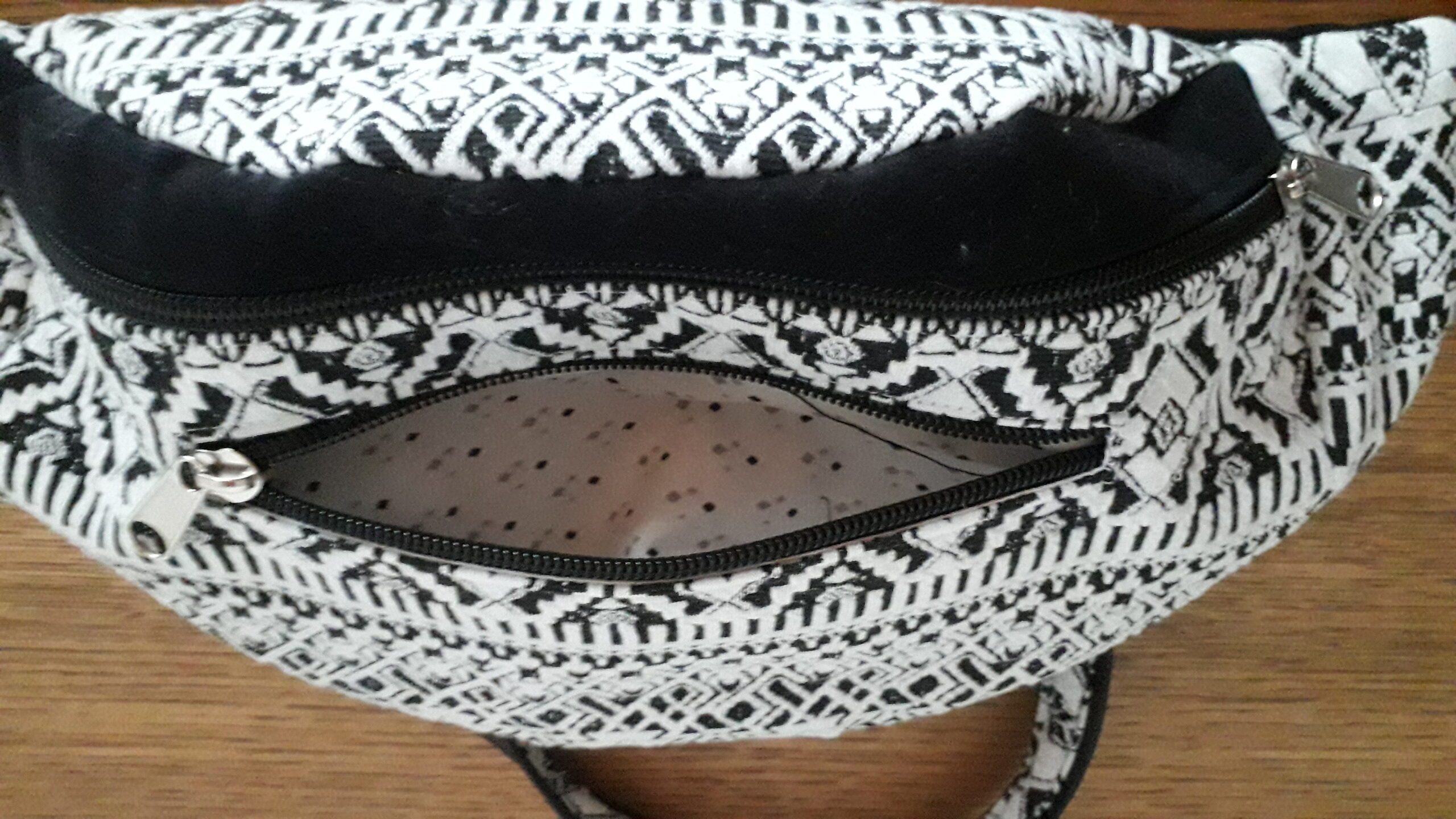 J’ai confectionné cette jolie banane dans un tissus 30% coton/70% polyester avec un motif géométrique noir et blanc, un bande sur le devant et le dos en suédine noire très douce.