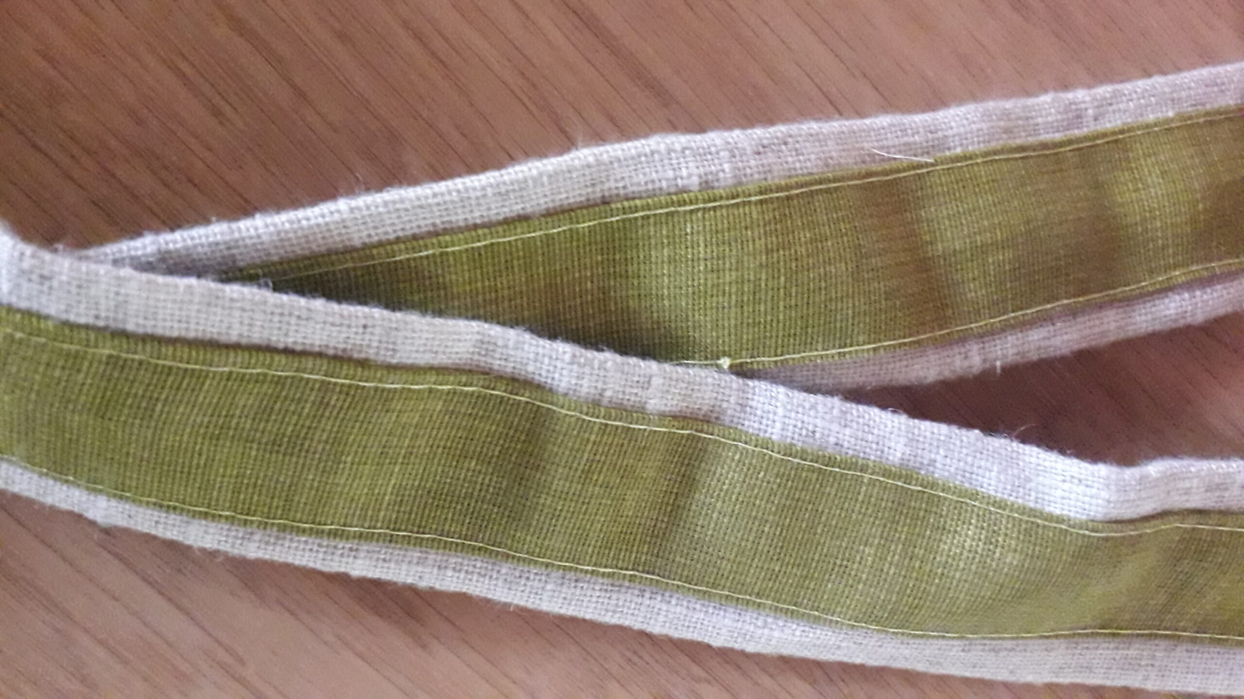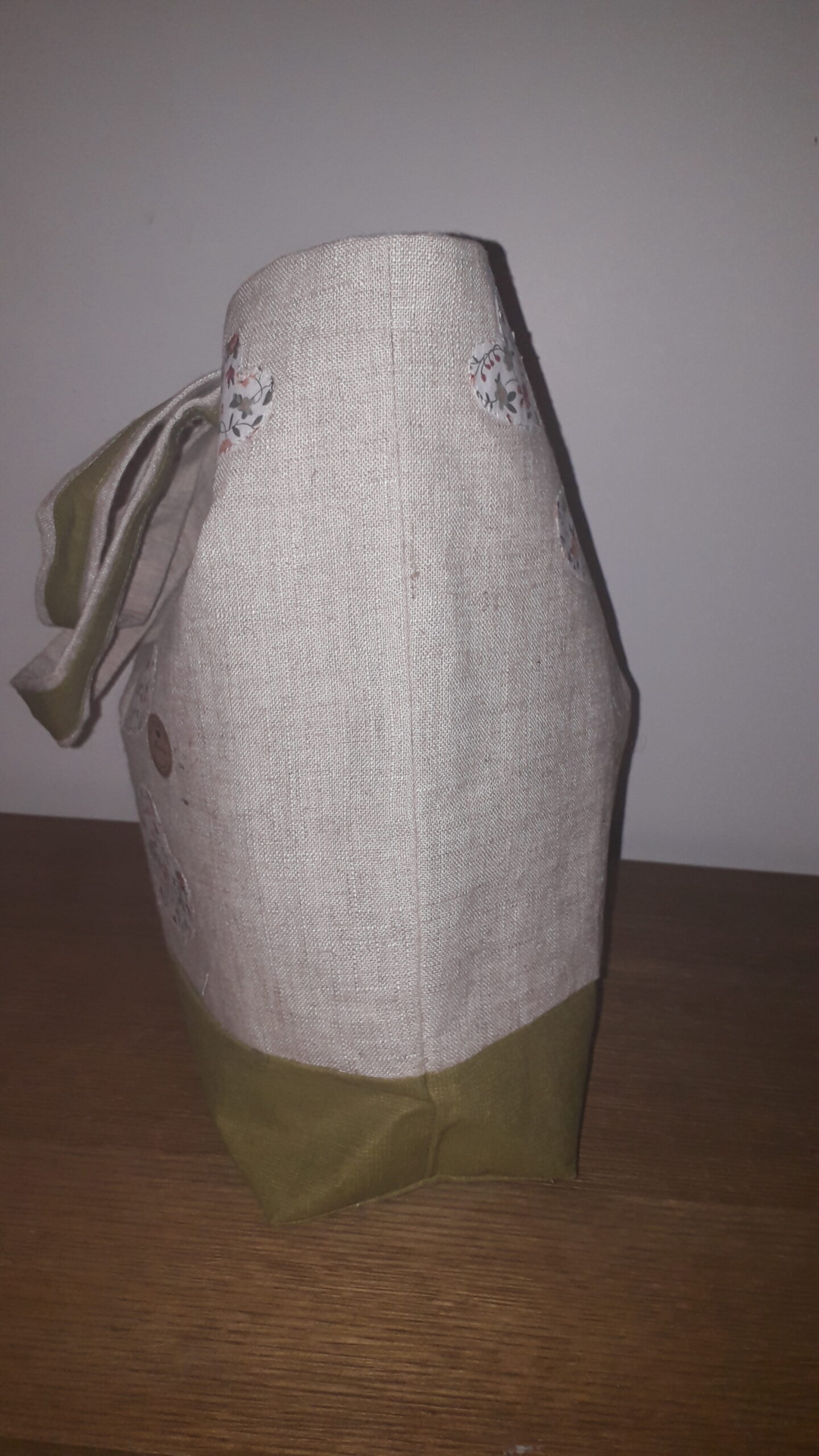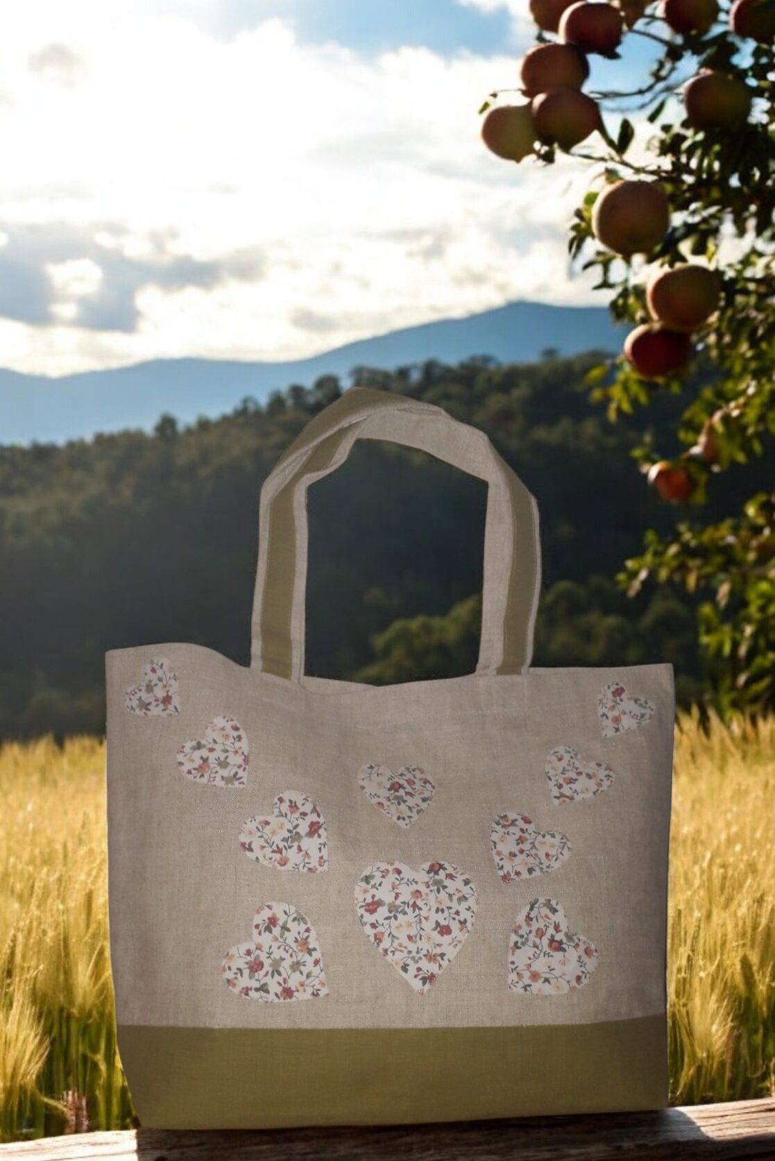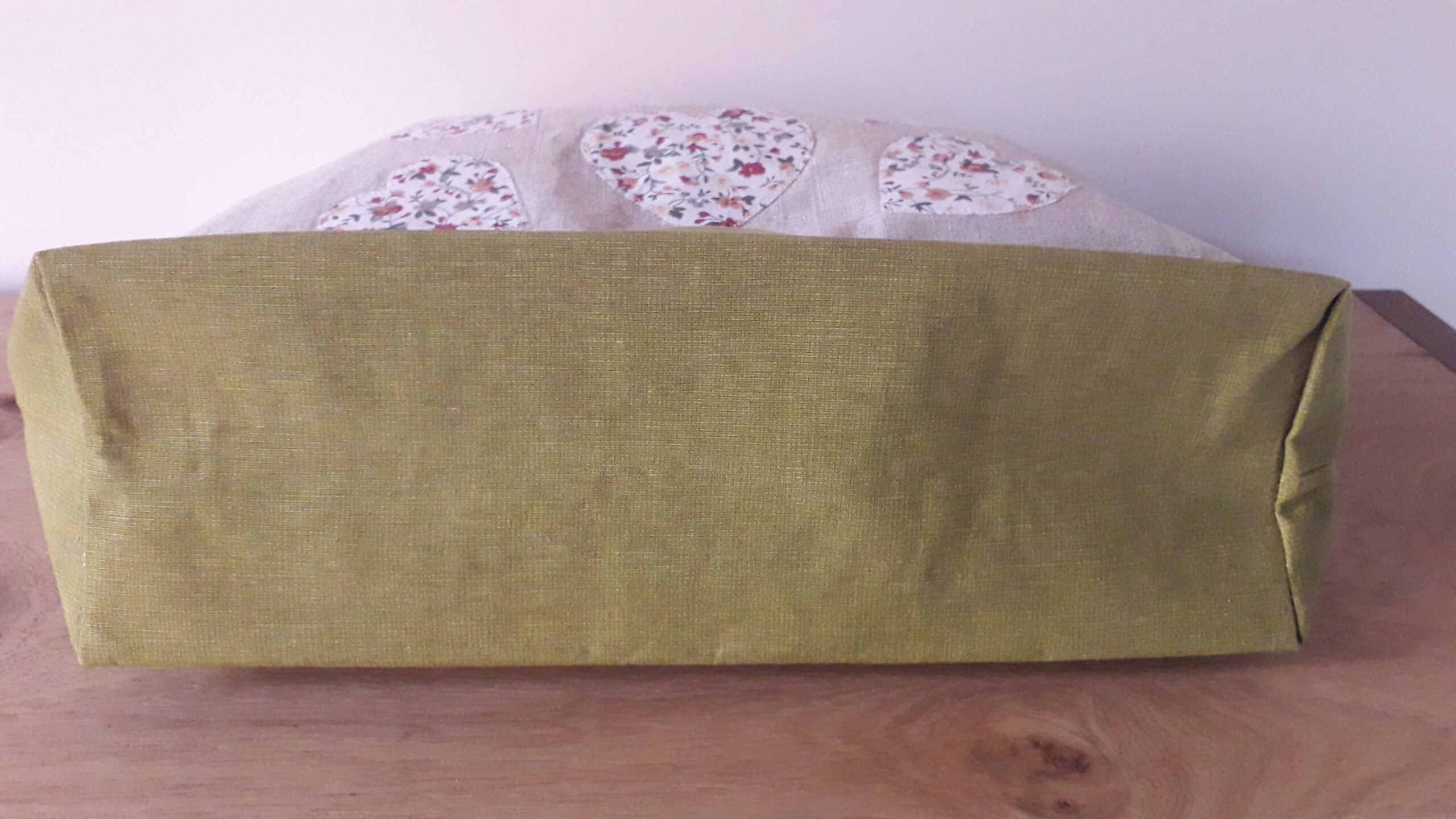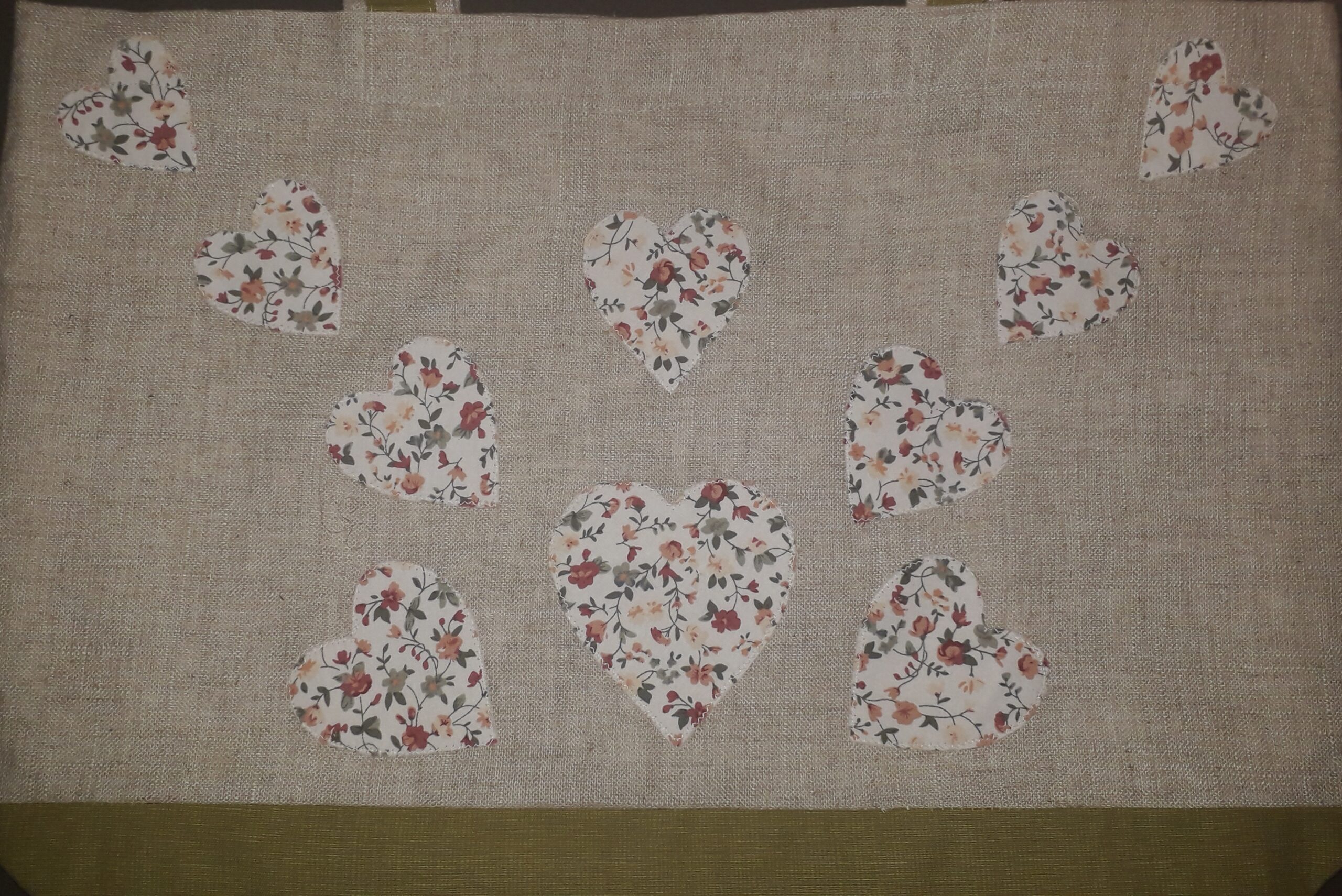J’ai confectionné ce cabas en toile de jute écrue et d’un tissu d’ameublement 100% polyester vert kaki, le tout d’agrémenté de cœurs en cotonnade fleurie (sur les deux faces du sac).