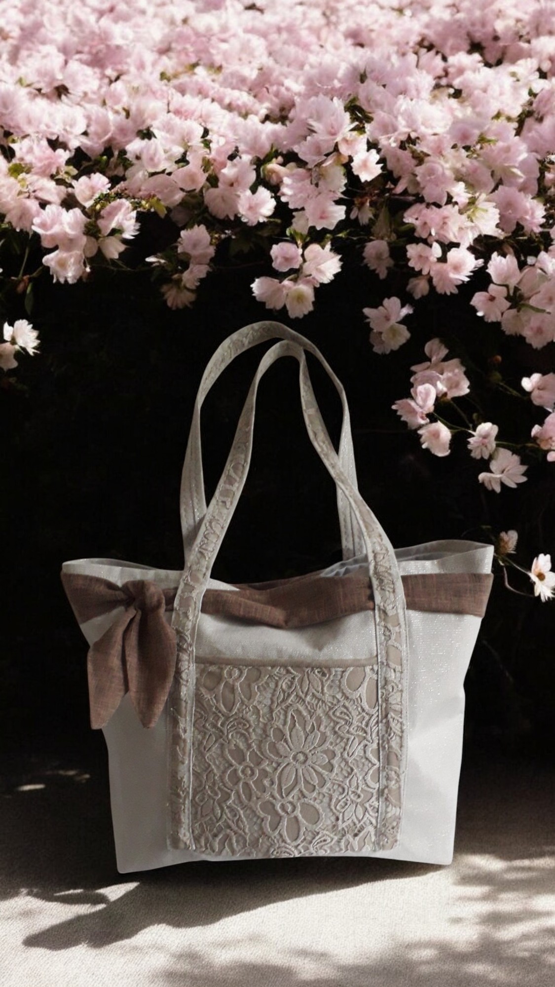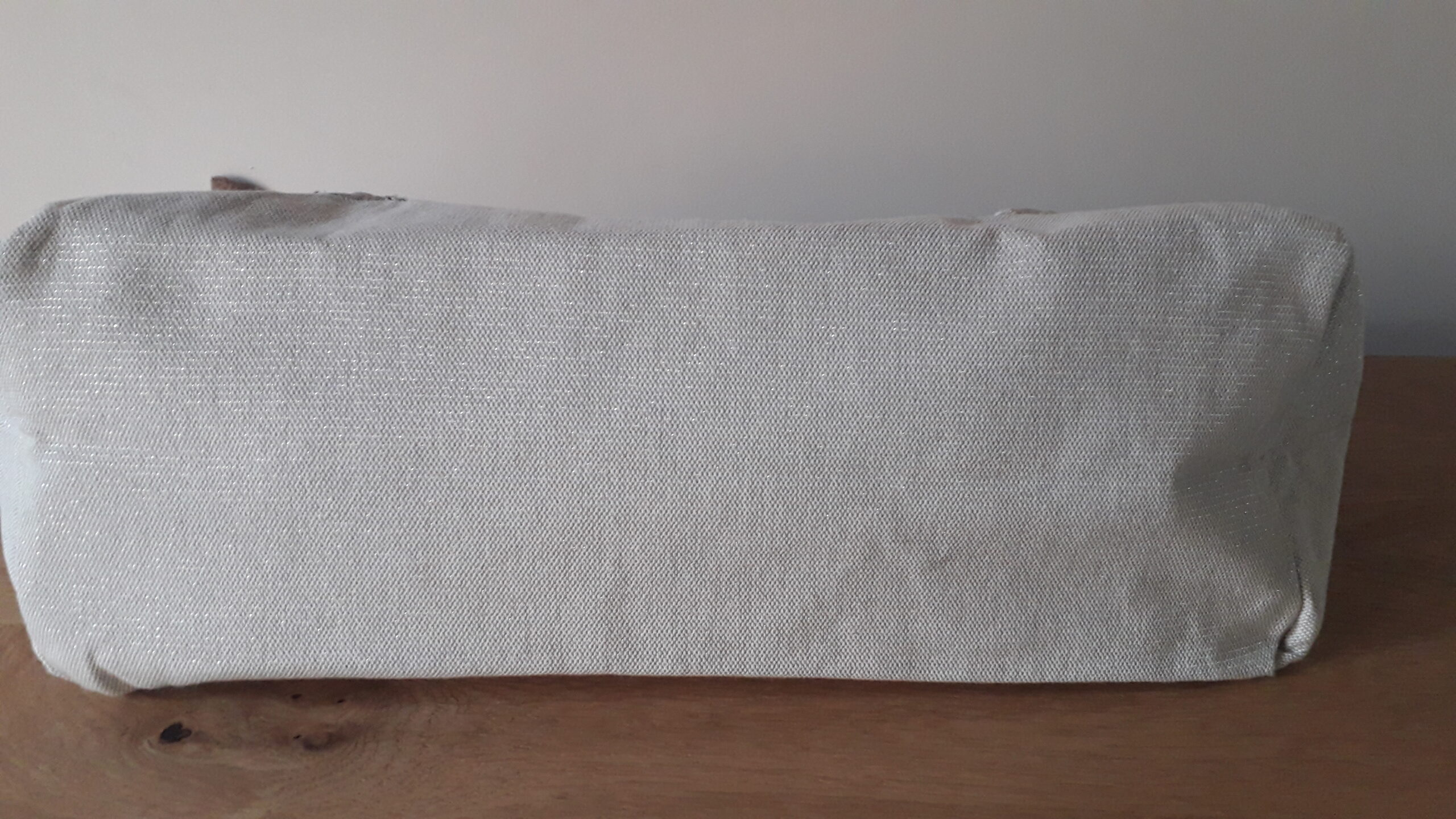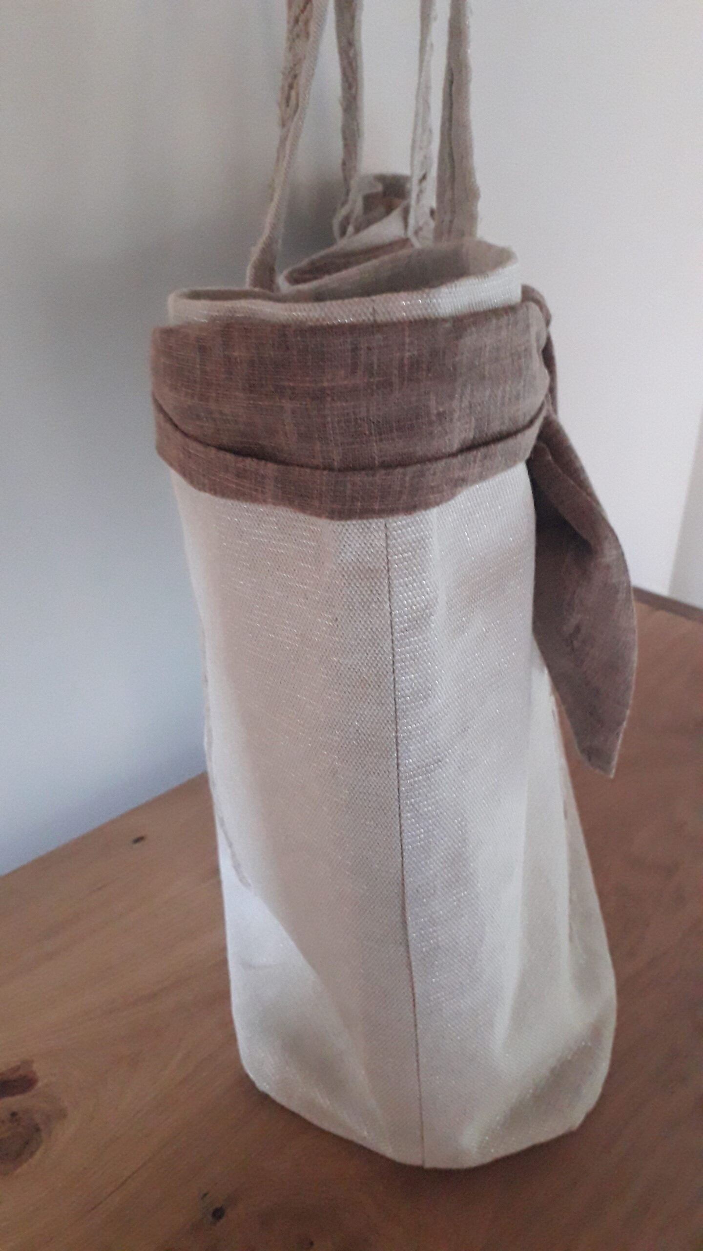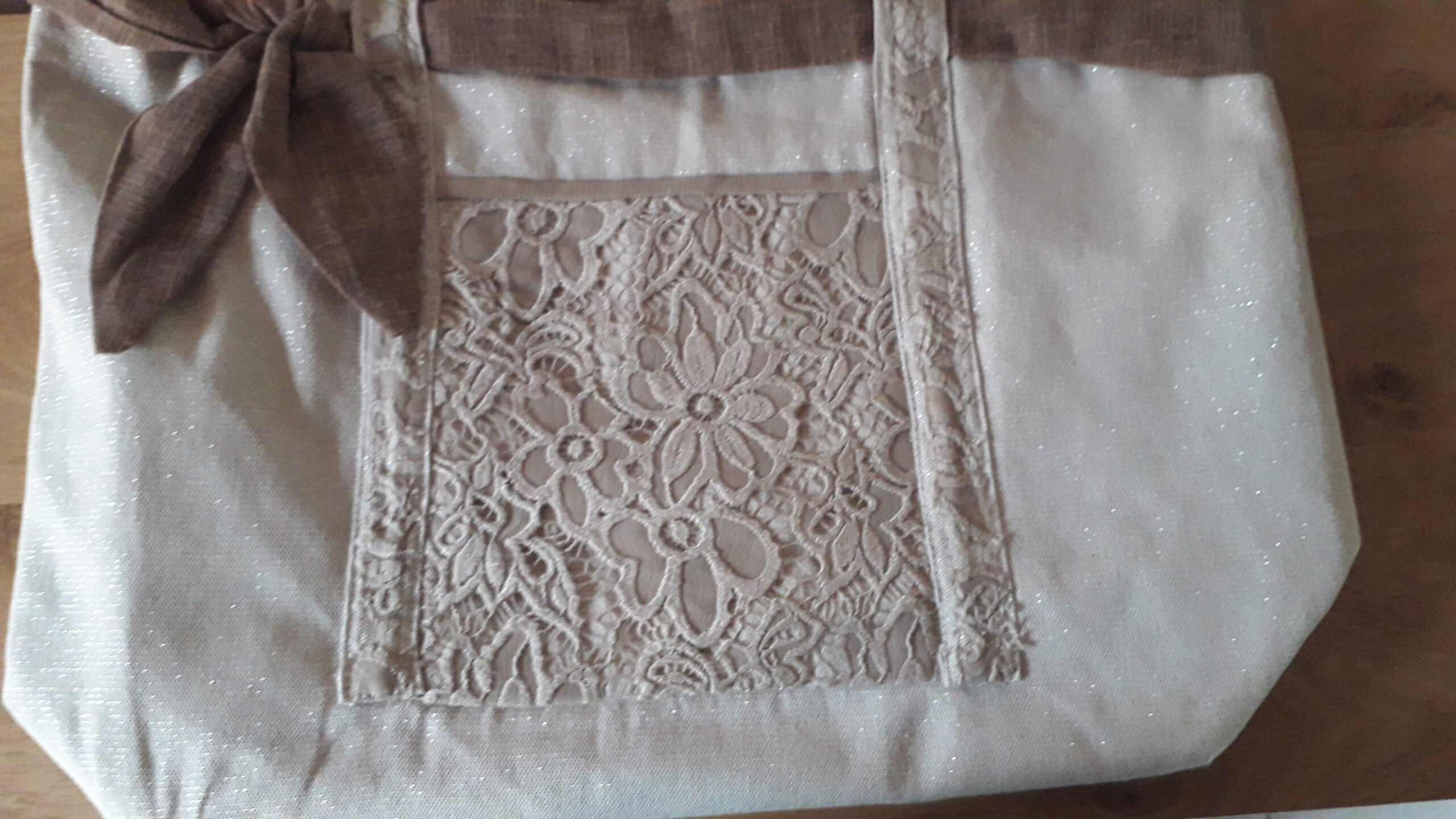 J’ai confectionné ce cabas en tissu coton/polyester écru avec une trame lurex métallique dorée donnant l’aspect légèrement brillant, une poche sur le devant en dentelle écrue, surmonté d’une ceinture en toile de jute légère marron .