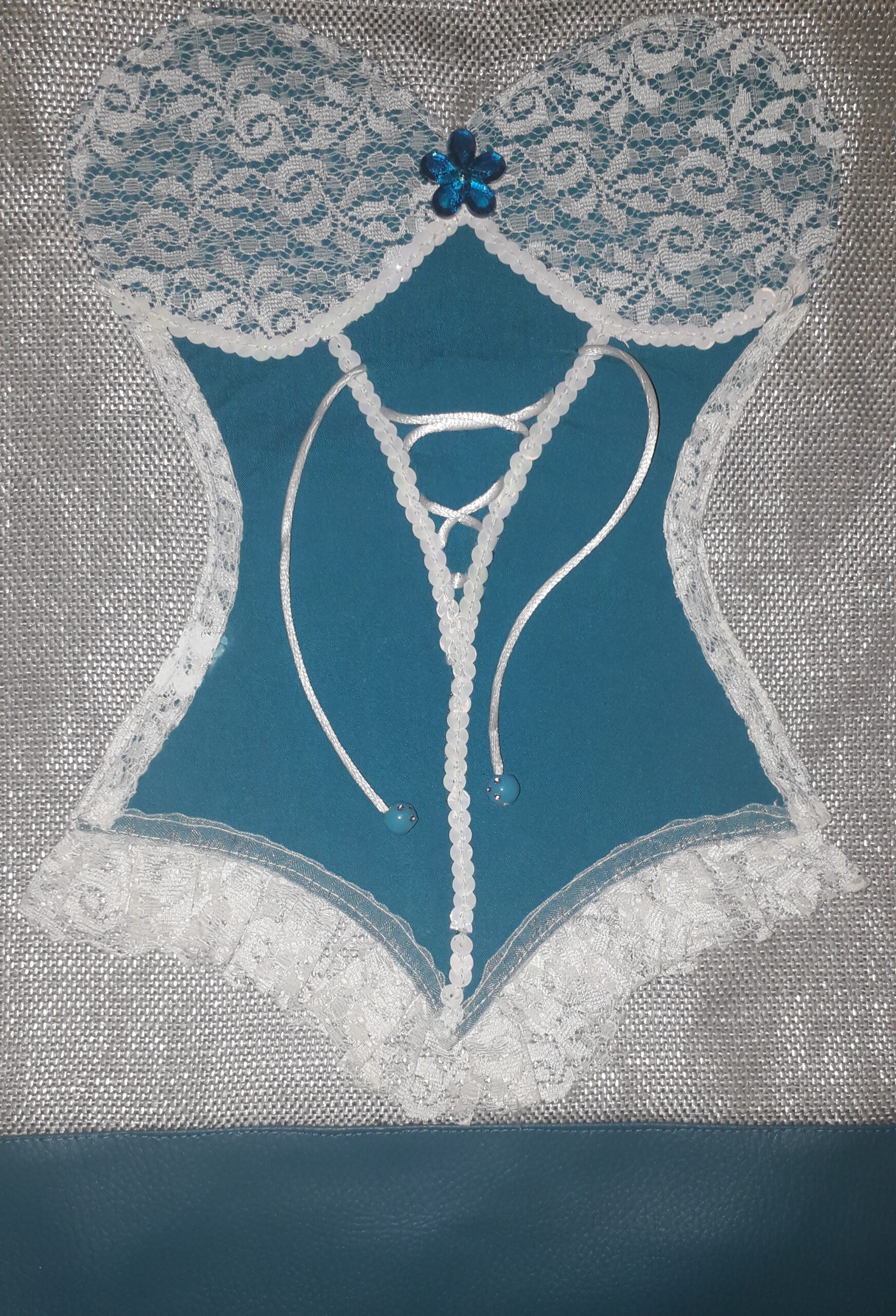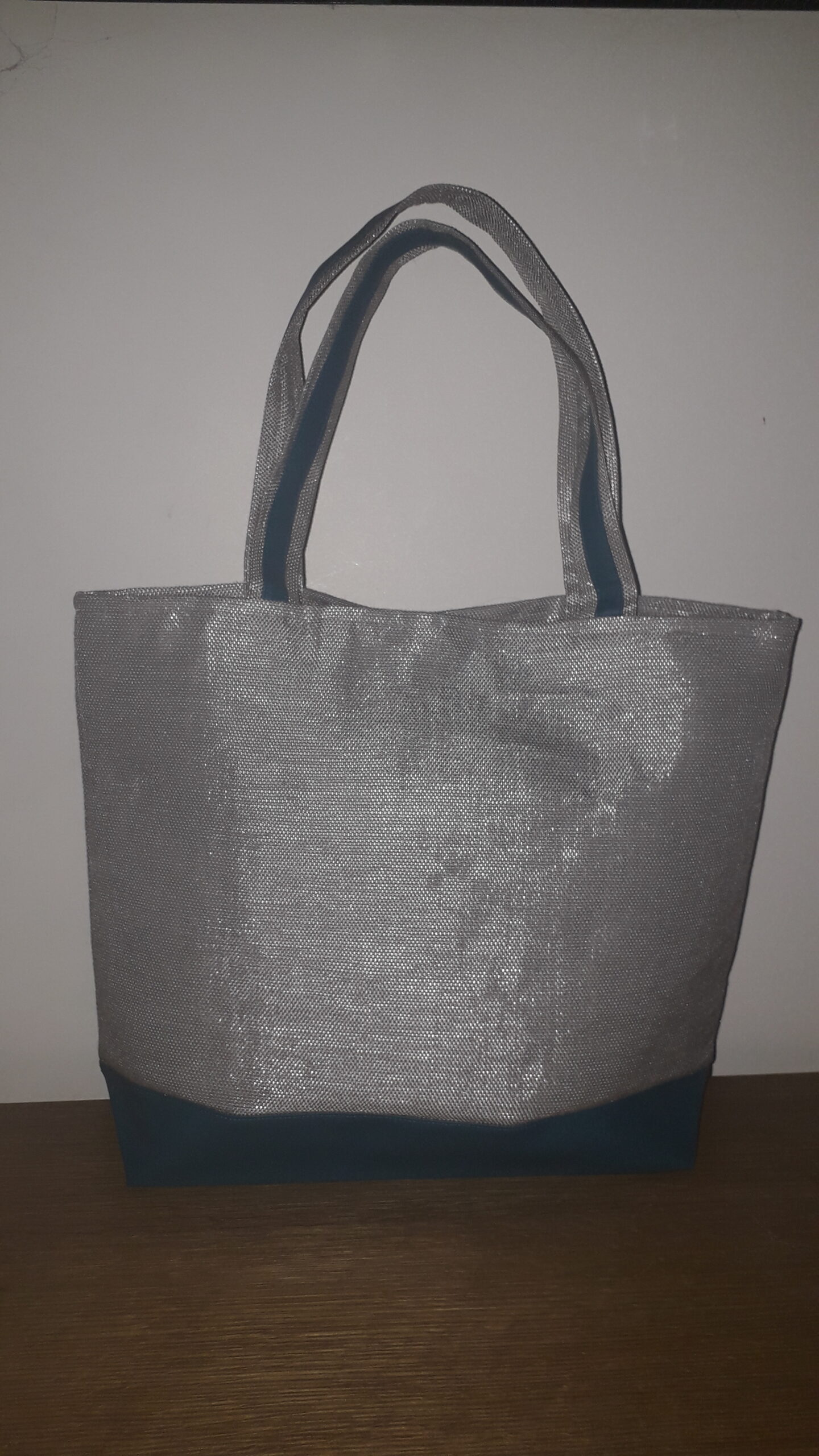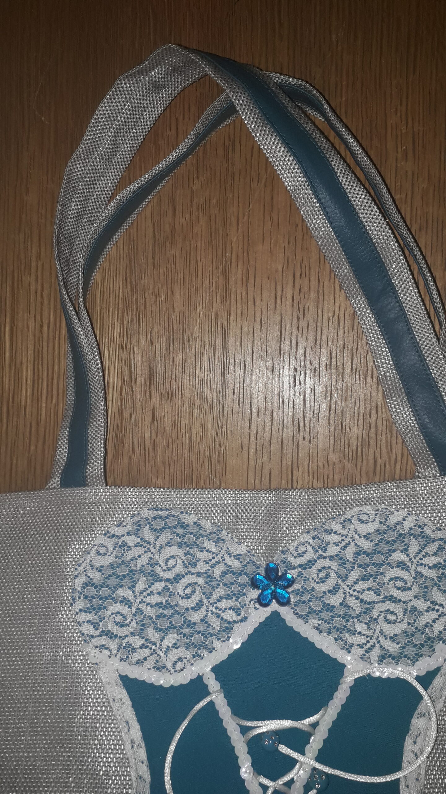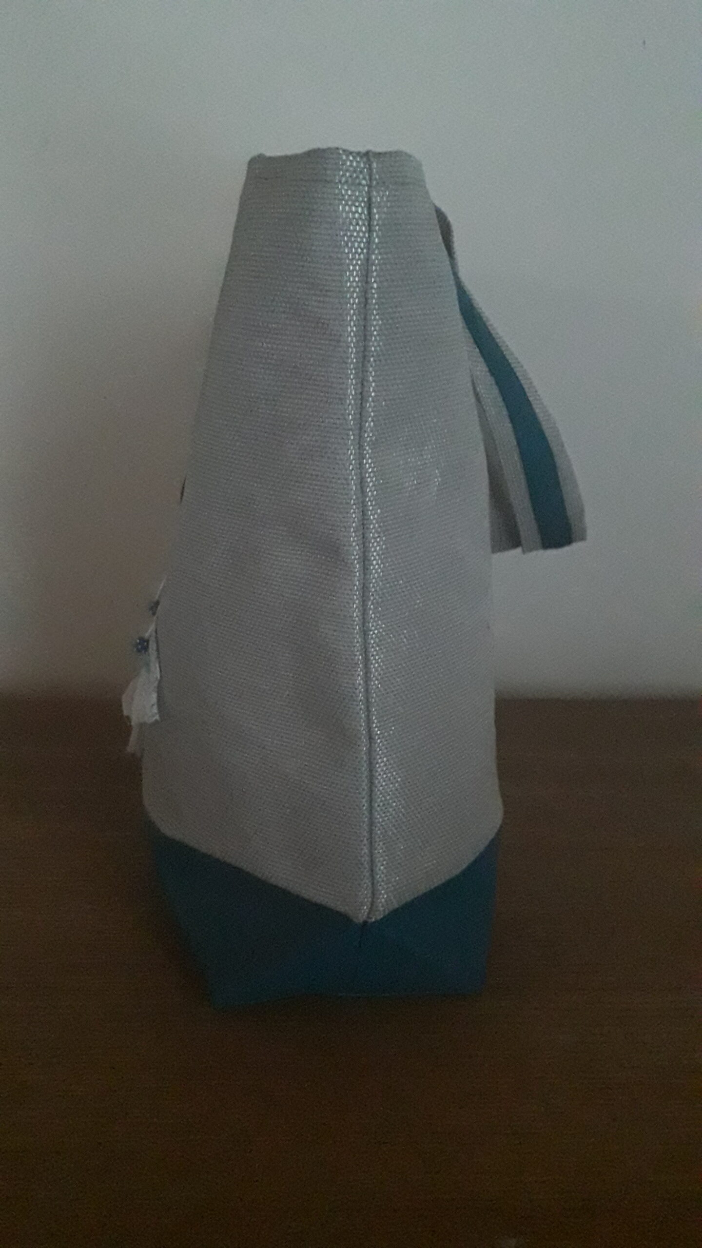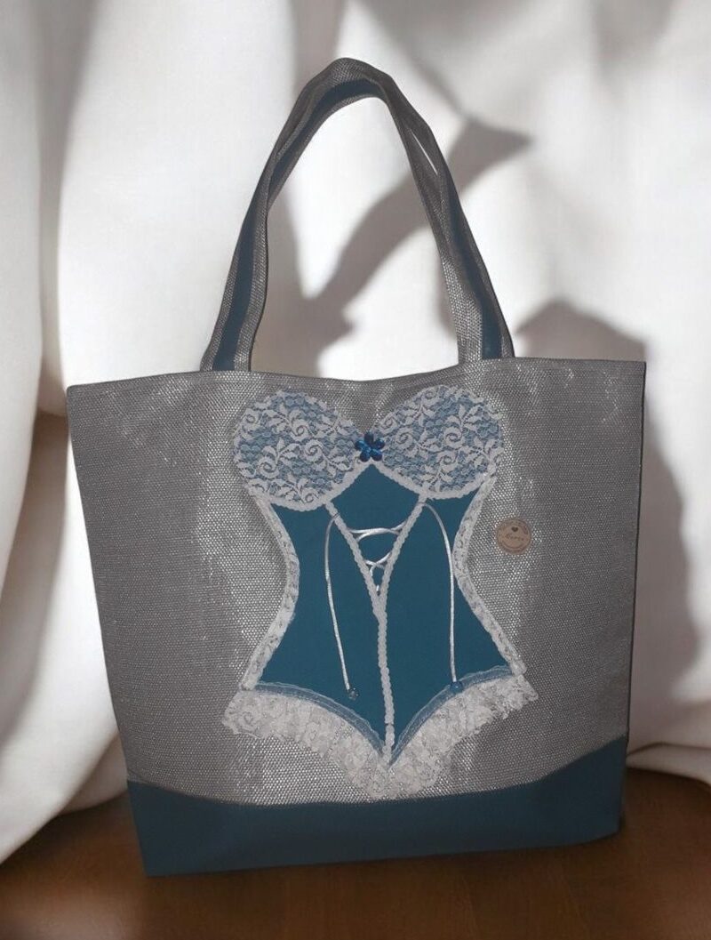 J’ai confectionné ce cabas en toile grille (raphia synthétique) pvc/polyester grise argentée, simili cuir bleu canard, surmonté d’un corset de coton bleu turquoise, dentelle blanche et d’un petit laçage en cordelette blanche terminé par 2 perles bleues.