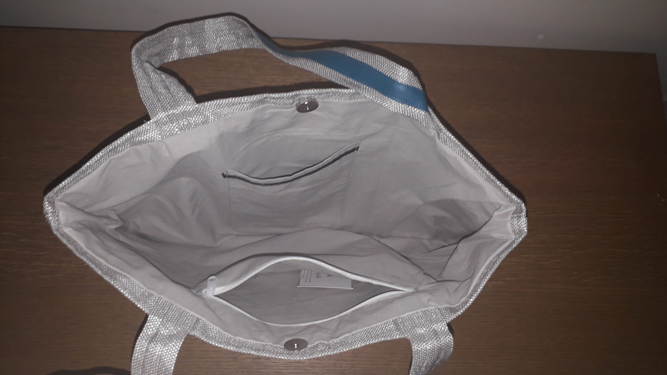 Entièrement doublé avec deux poches intérieures dont une zippée. Double anse de 50cm, il se ferme à l’aide d’une pression magnétique.
