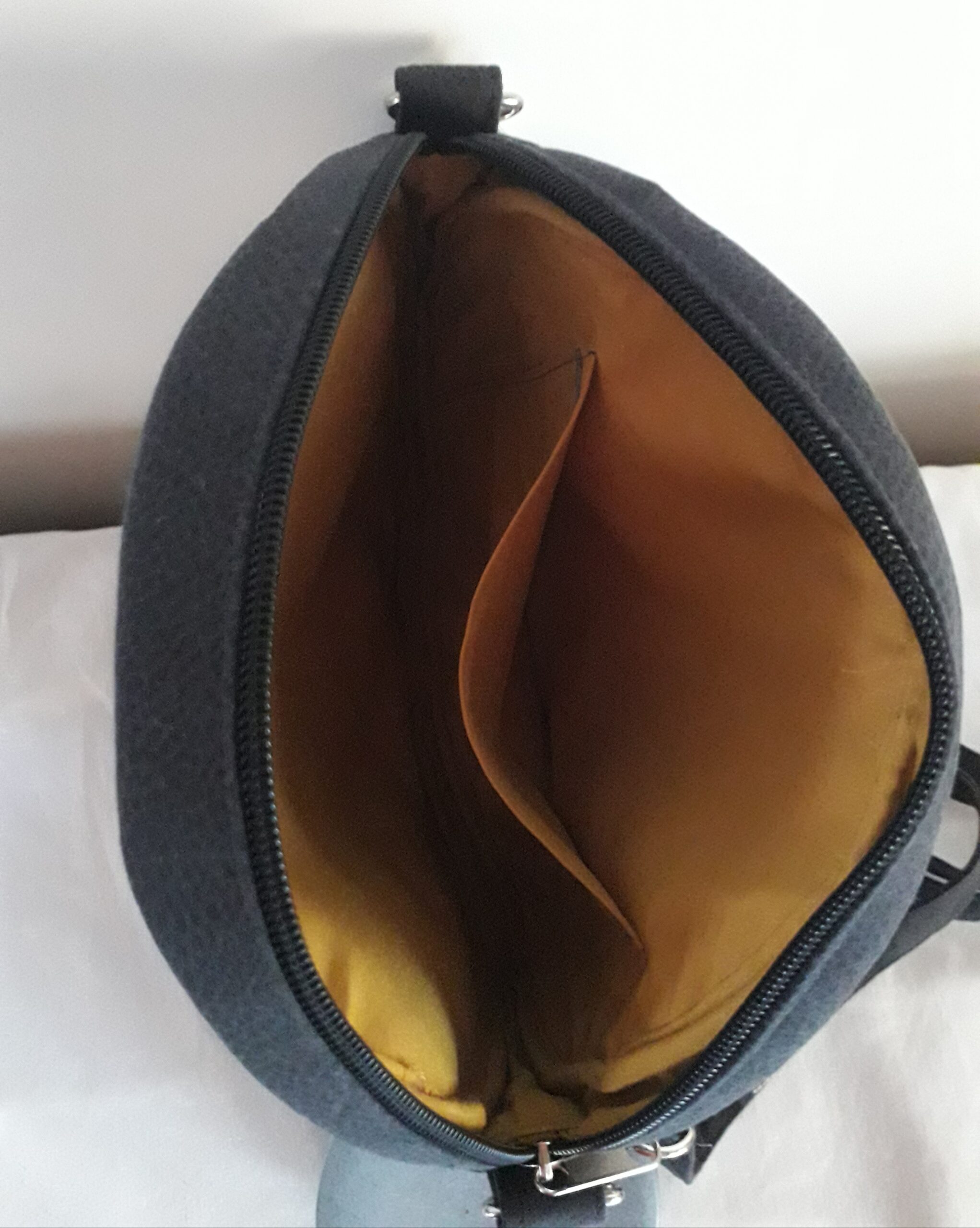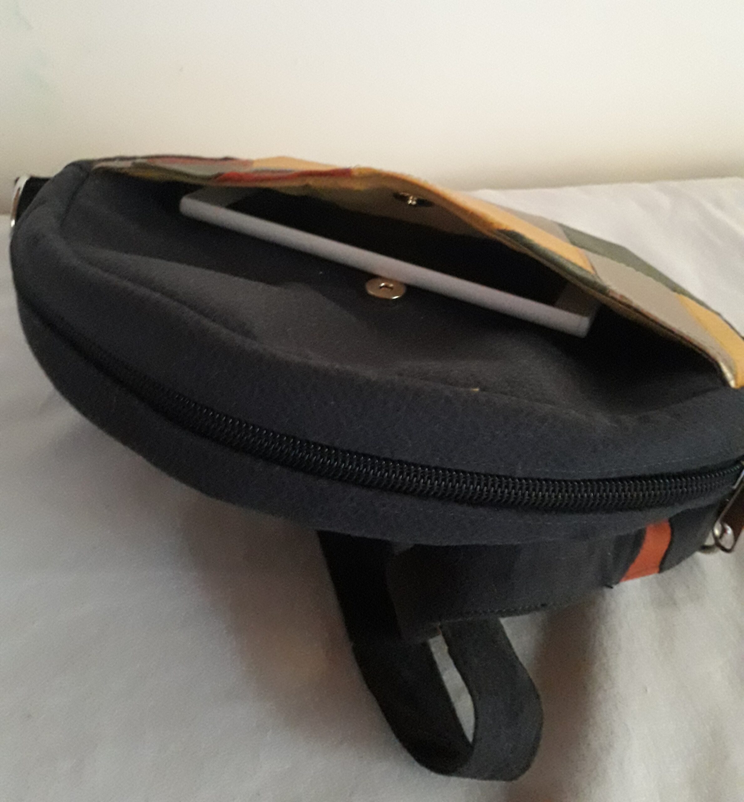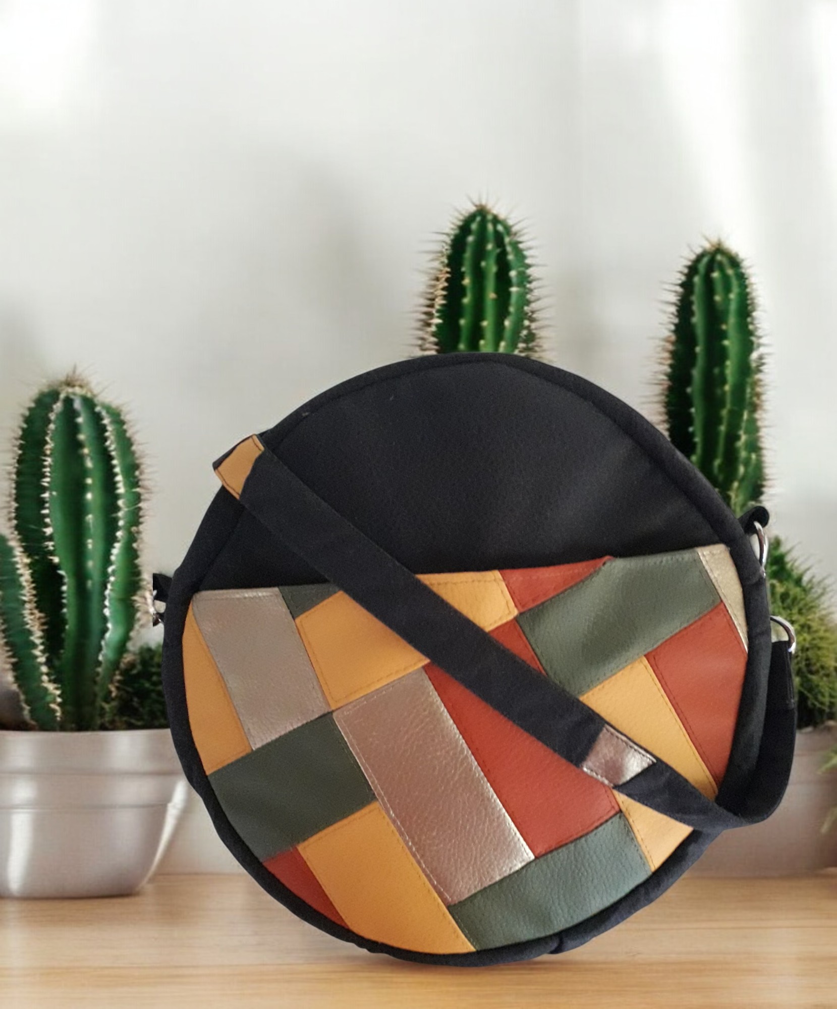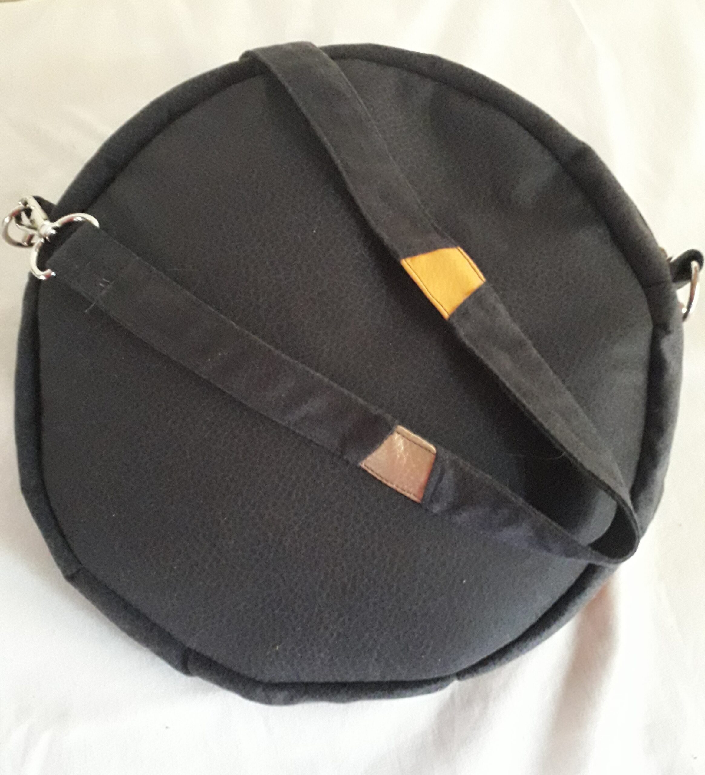 J’ai confectionné ce sac rond en flanelle légèrement structurée grise foncée, muni d’une grande poche sur le devant, fermé par une pression magnétique en patchwork de simili cuir aux couleurs brique, kaki, or et moutarde. une bandoulière de 120cm réglable assortie au sac. Entièrement doublé avec une poche plaquée à l’intérieur, une ouverture de 28cm zippée.