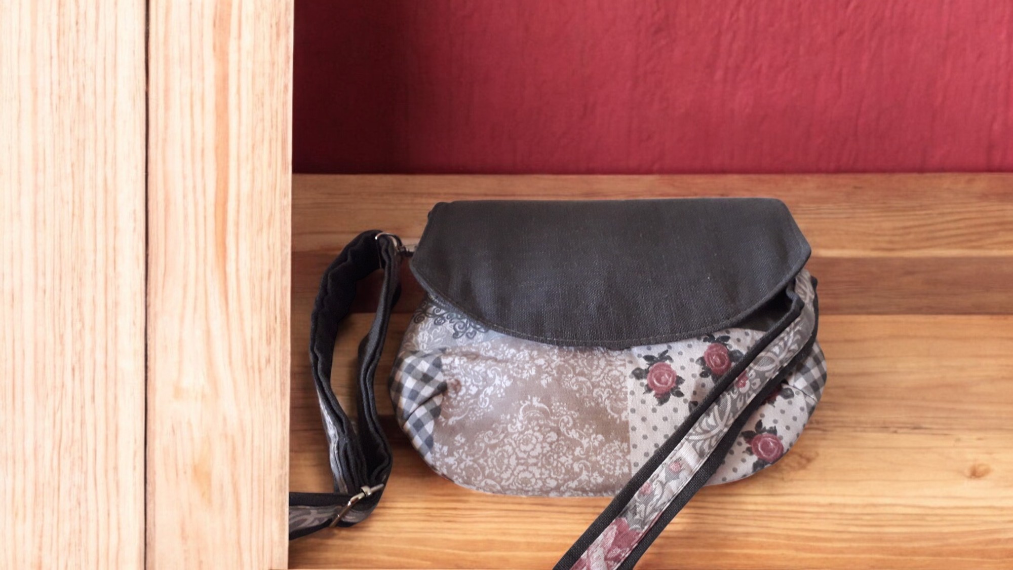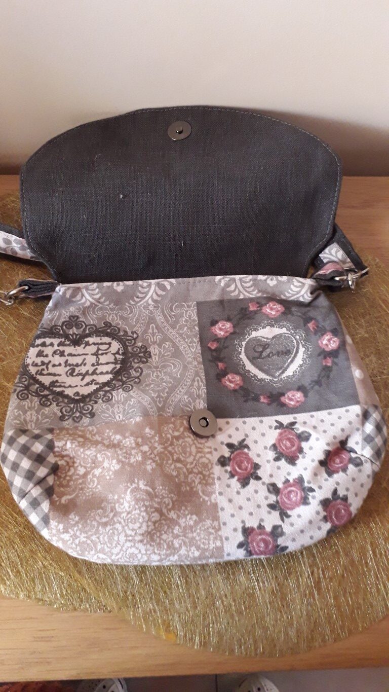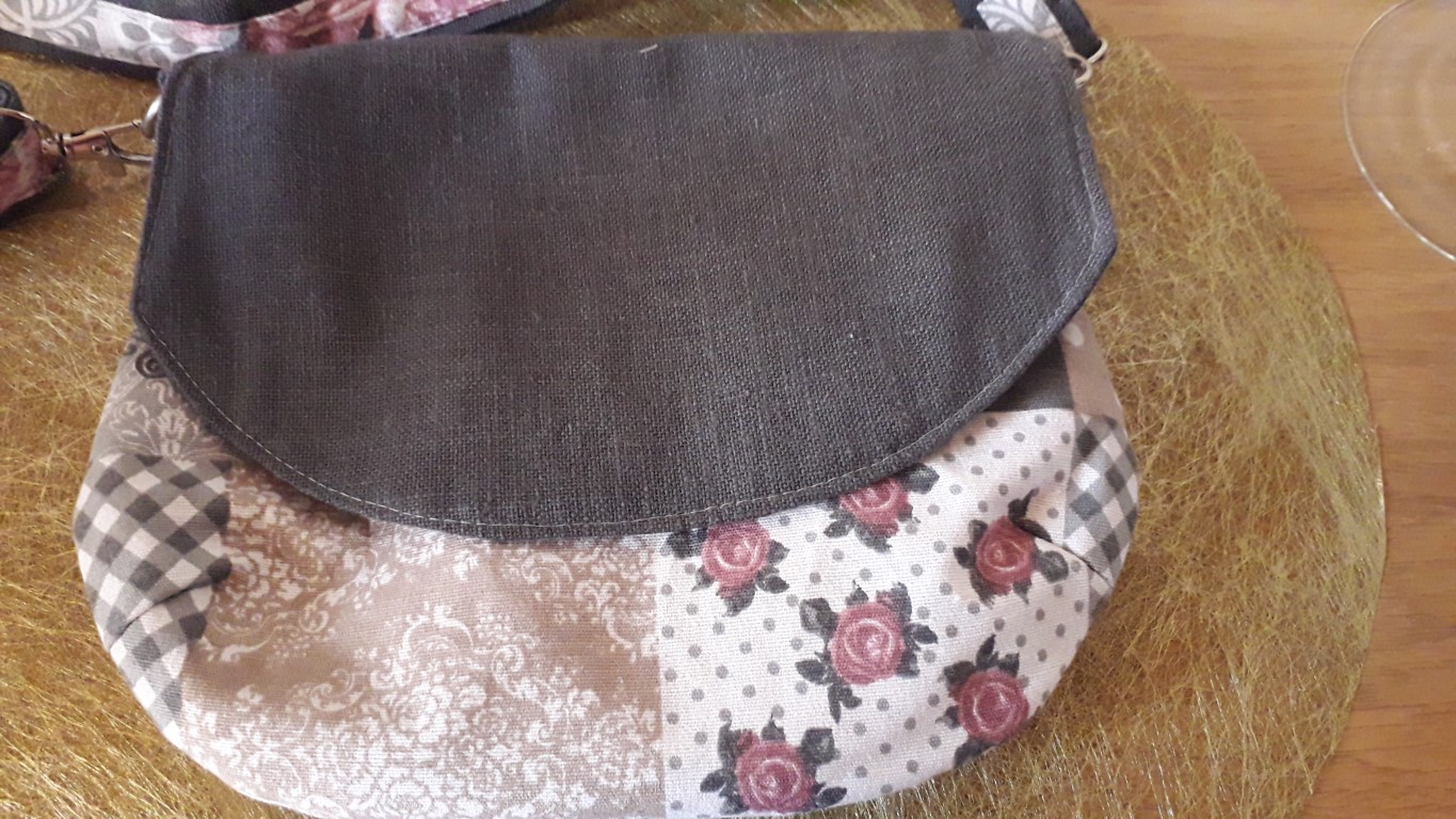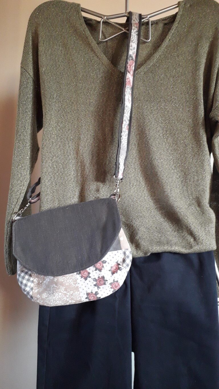 Petit sac à bandoulière, bi-matière. Rabat aimanté en toile de jute gris